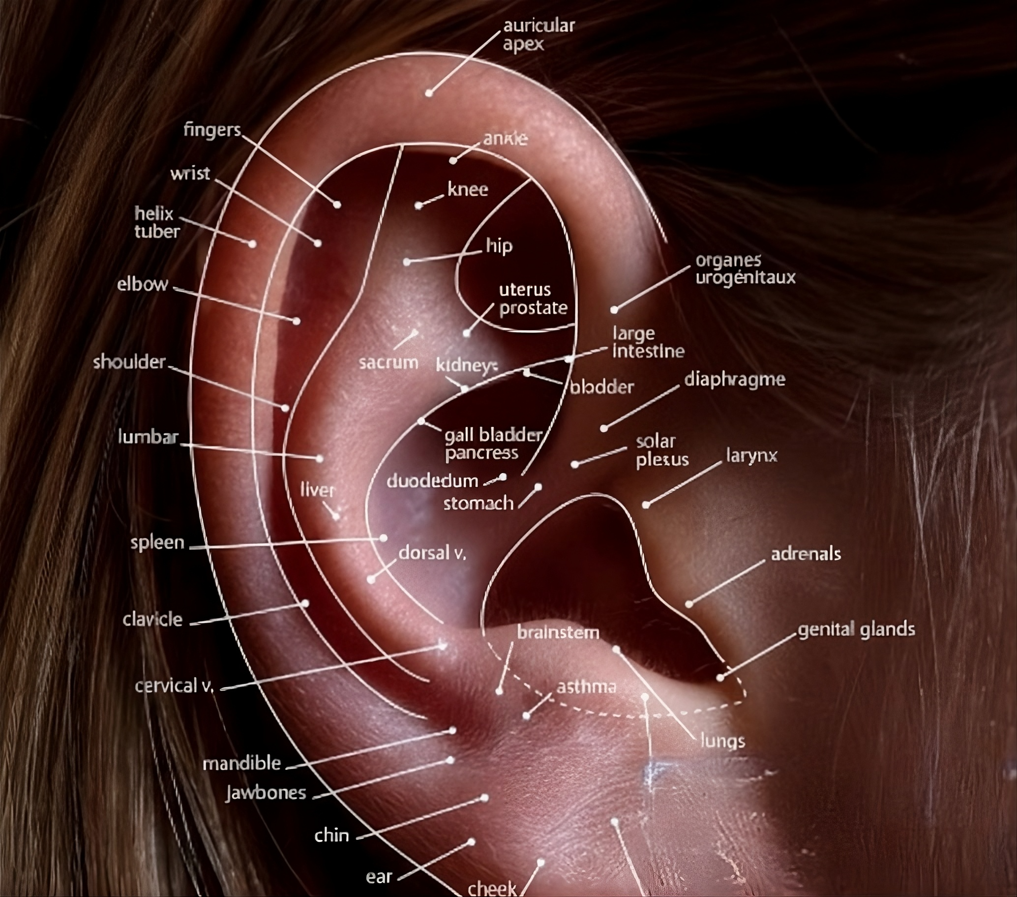 A fül egy úgynevezett mikrorendszer, amely az egész testet tükrözi, így a megfelelő pontok ingerlésével a test különböző működései is támogathatók.